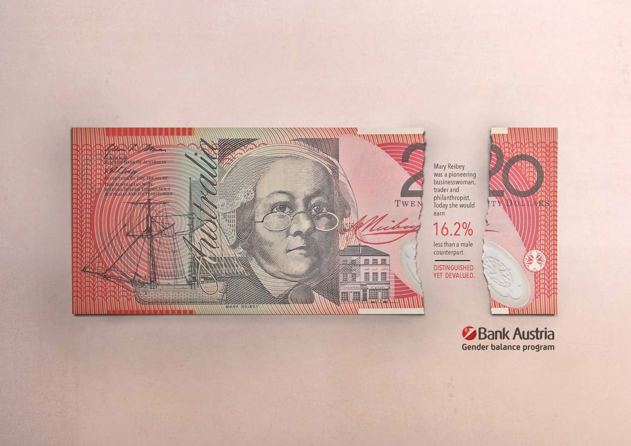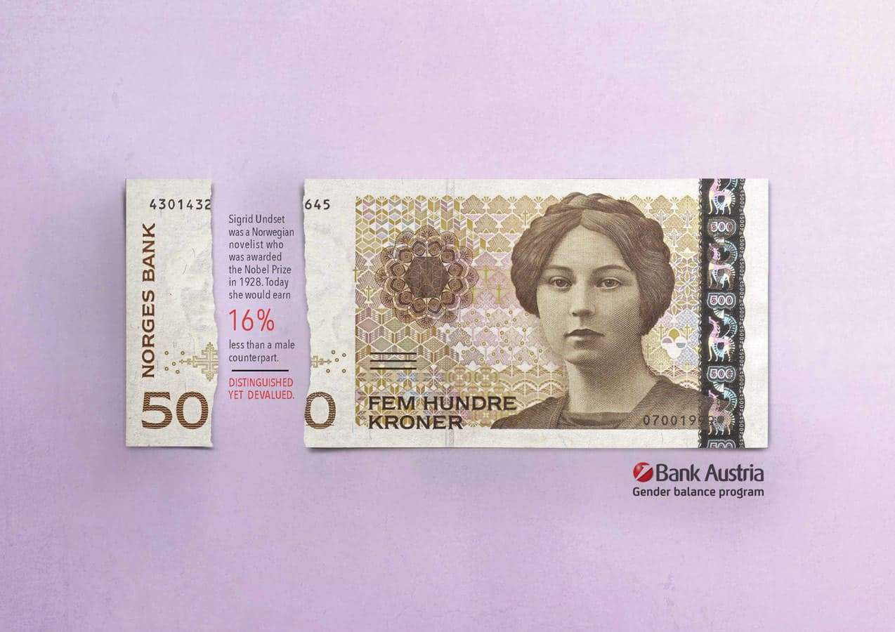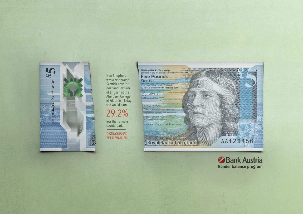 Bankers may be great with numbers but the finance industry is still one of the worst performers in terms of equal pay between genders. But to their credit, Unicredit Bank has implemented a 'Gender Balance Program'. I was responsible for the concept and messaging in this campaign to raise awareness of the program. It plays with existing bank notes that feature prominent female figures from history. The torn gap in the bank note references the actual gender pay gap in the country of origin, to highlight the issue of equal pay amongst Unicredit Bank employees.