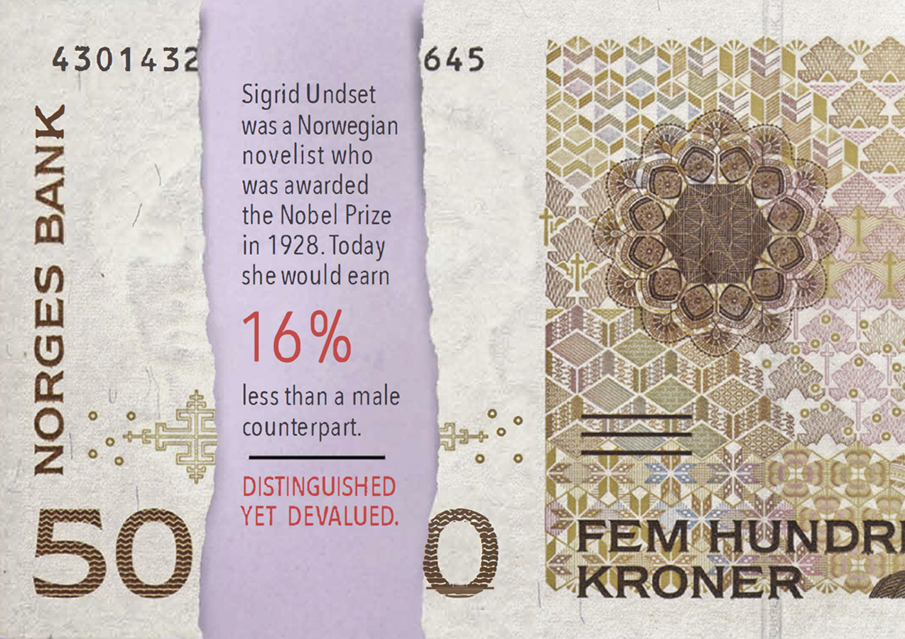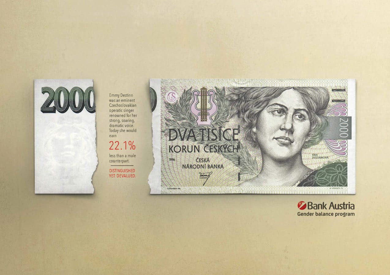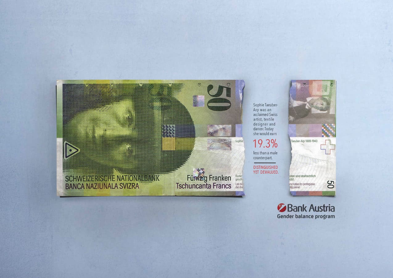 Bankers may be great with numbers but the finance industry is still one of the worst performers in terms of equal pay between genders. But to their credit, Unicredit Bank has implemented a 'Gender Balance Program'. I was responsible for the concept and messaging in this campaign to raise awareness of the program. It plays with existing bank notes that feature prominent female figures from history. The torn gap in the bank note references the actual gender pay gap in the country of origin, to highlight the issue of equal pay amongst Unicredit Bank employees.